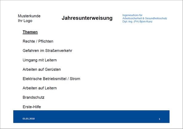 Jährliche Unterweisungen im Arbeitsschutz, die sich anhand Ihrer Gefährdungsbeurteilung ergeben führe ich für Sie durch. Dabei können einzelne Schwerpunkte, die sich z.B. aus gefährlichen Situationen oder Unfällen im vergangenen Jahr in Ihrem Betrieb ergeben eingebracht werden.